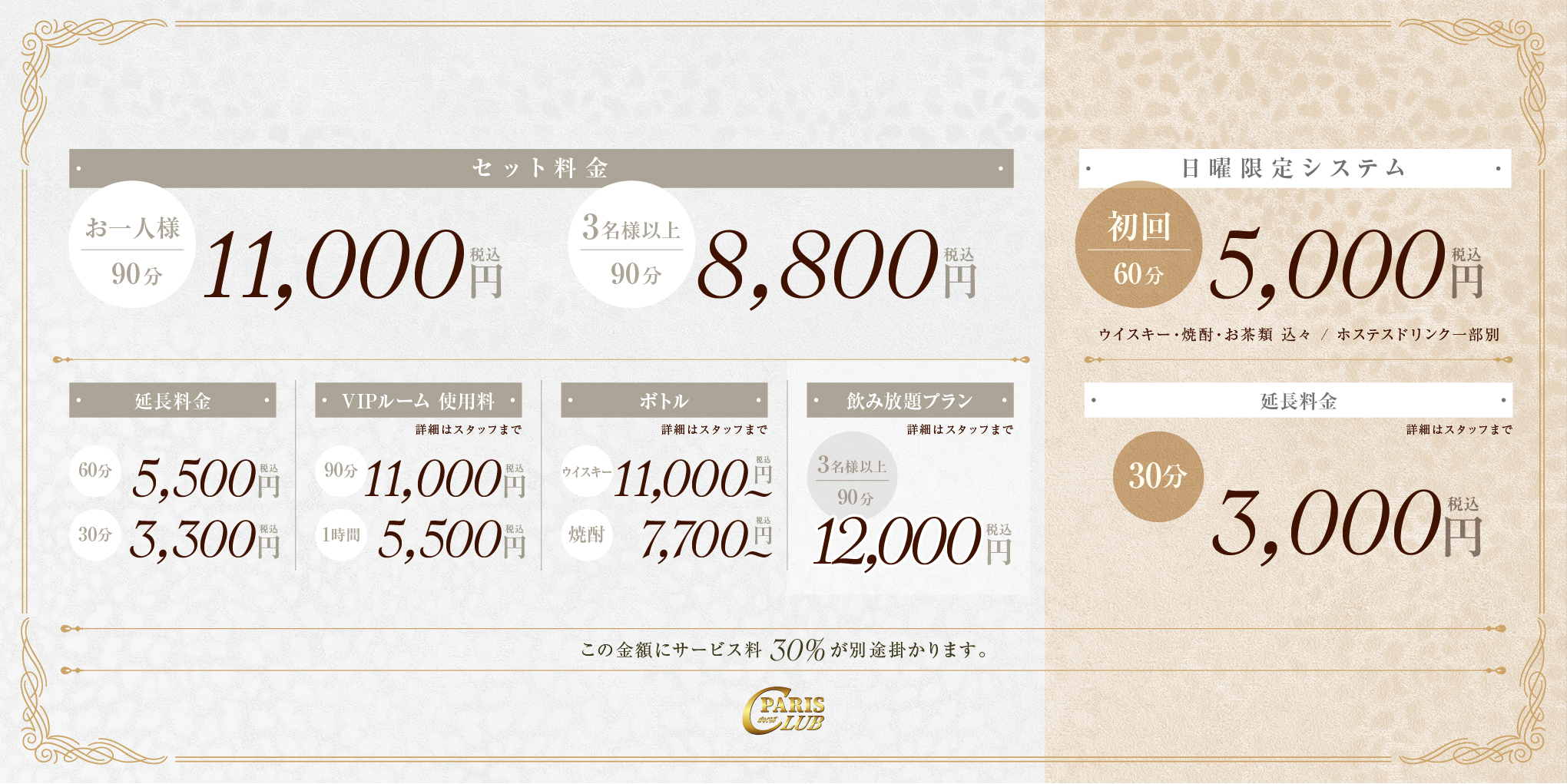 ご覧いただきありがとうございます。パリクラブより定休日変更のお知らせをさせていただきます。 2026年4月26日(日)から日曜営業となります。今後は月曜日と祝日が定休となります。 日曜日のシステム料金 日曜日も皆様と素敵 […] -